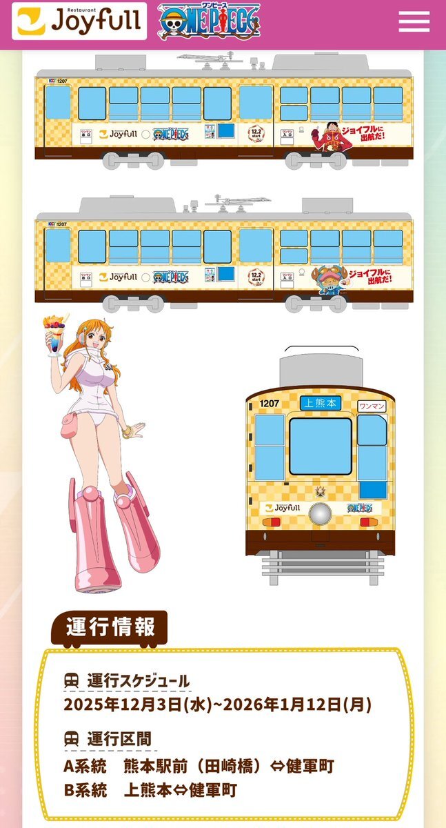 【コラボ情報】 12.2(火)15:00より ファミリーレストラン ジョイフルとコラボ決定🍽️ 第1弾として全7品の コラボメニューが楽しめるほか ノベルティプレゼントも実施! さらに熊本県熊本市内では、 コラボデザインのラッピング電車が運⾏! ▼くわしくはこちら lp.joyfull.co.jp/one-piece2025 #ONEPIECE