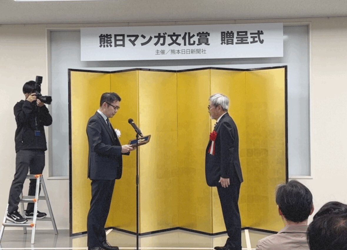 第4回熊日マンガ文化賞贈呈式に来たにゃ🐾 受賞者はコアミックス社長、堀江信彦さんだにゃ!! おめでとう御座いにゃす! #マンガ県くまもと pic.x.com/tmfZYxWRkr