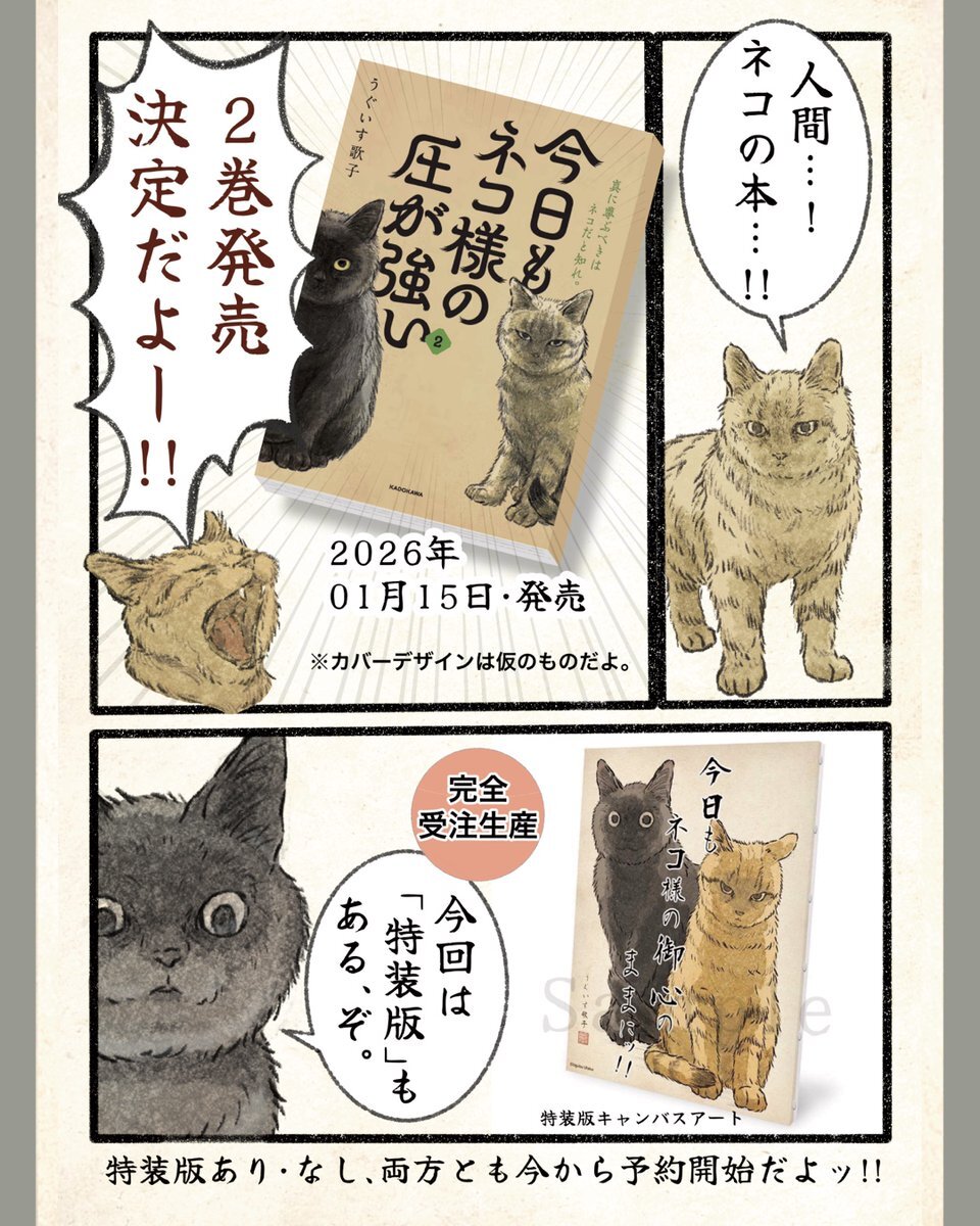 熊本在住の漫画家 #うぐいす歌子 先生の「#今日もネコ様の圧が強い」2巻が来年1月に発売決定だにゃ! 予約も開始。 全ネコから共感の嵐!猫好きあるあるの波が押し寄せるネコ好きのためのマンガだにゃ。 読まにゃん! #マンガ県くまもと x.com/frgunsou/statu…
