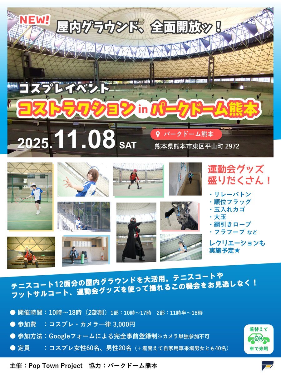 💥コスプレでスポーツが楽しめる💥 コストラクションinパークドーム熊本 11月8日(土) 開催 屋内グラウンド全面開放‼ テニスやサッカー、運動会種目で 撮れる📸遊べる✨✨ 小道具も盛りだくさん👍 事前登録はコチラ👇 forms.gle/3sAA3Qst6tZWXc… #コストラ #パークドーム熊本 #コスプレイベント
