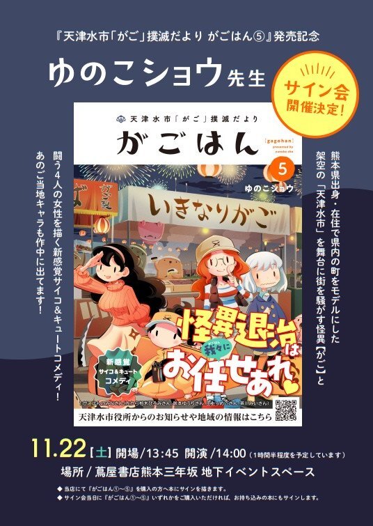 11/22(土)に熊本出身のマンガ家 #ゆのこショウ 先生のサイン会を #蔦屋書店熊本三年坂 での開催が決まりました! 本日発売(熊本は11/7入荷)の『天津水市「がご」撲滅だより がごはん⑤』発売記念イベントとなります。 詳細は添付の画像をご参照ください。 皆さんのご来場お待ちしてます! #がごはん