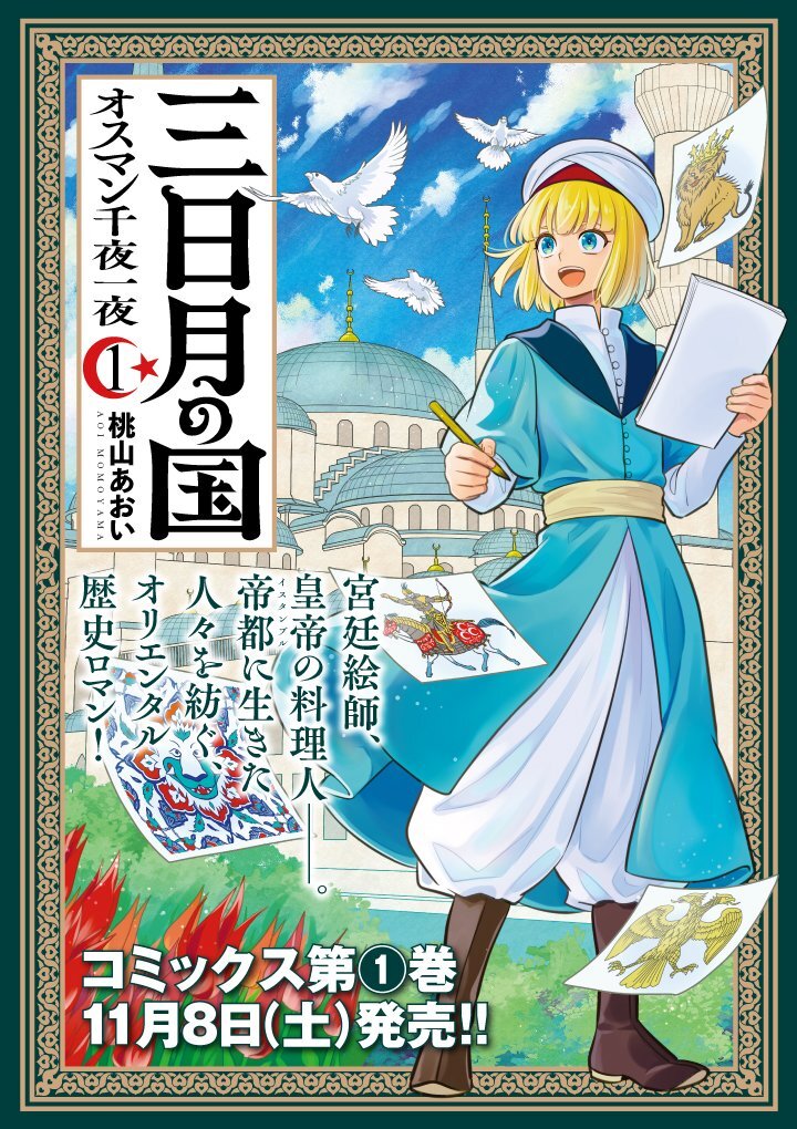 熊本在住の漫画家 #桃山あおい 先生が描く『#三日月の国オスマン千夜一夜』の1巻がめでたく発売されるにゃ! 発売日は本日。 オスマン帝国の宮廷工房で働く新人絵師のレオを主人公とした歴史ロマン作品だにゃ。 買って読まにゃんよー。 #マンガ県くまもと pic.x.com/kh1doc4RSl