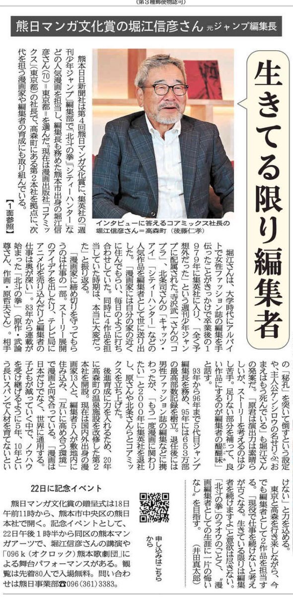 第4回熊日マンガ文化賞の受賞者が決定! 熊本出身で漫画出版会社コアミックスの社長:#堀江信彦 さんだにゃ。 コアミックスは高森町に第2本社を置く出版社で熊本発信の漫画家育成などに貢献されたにゃ。 11月22日には授賞式が行われるにゃ。 観覧希望は↓ gettiis.jp/event/detail/1… #マンガ県くまもと pic.x.com/7y3re5tYbb