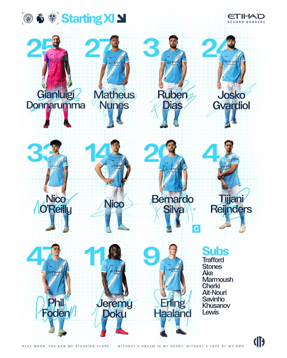 Your City side to face Leeds! 💪🩵 XI | Donnarumma, Nunes, Dias, Gvardiol, O’Reilly, Nico, Bernardo (C), Reijnders, Foden, Doku, Haaland SUBS | Trafford, Stones, Ake, Marmoush, Cherki, Ait-Nouri, Savinho, Khusanov, Lewis 🤝 @etihad