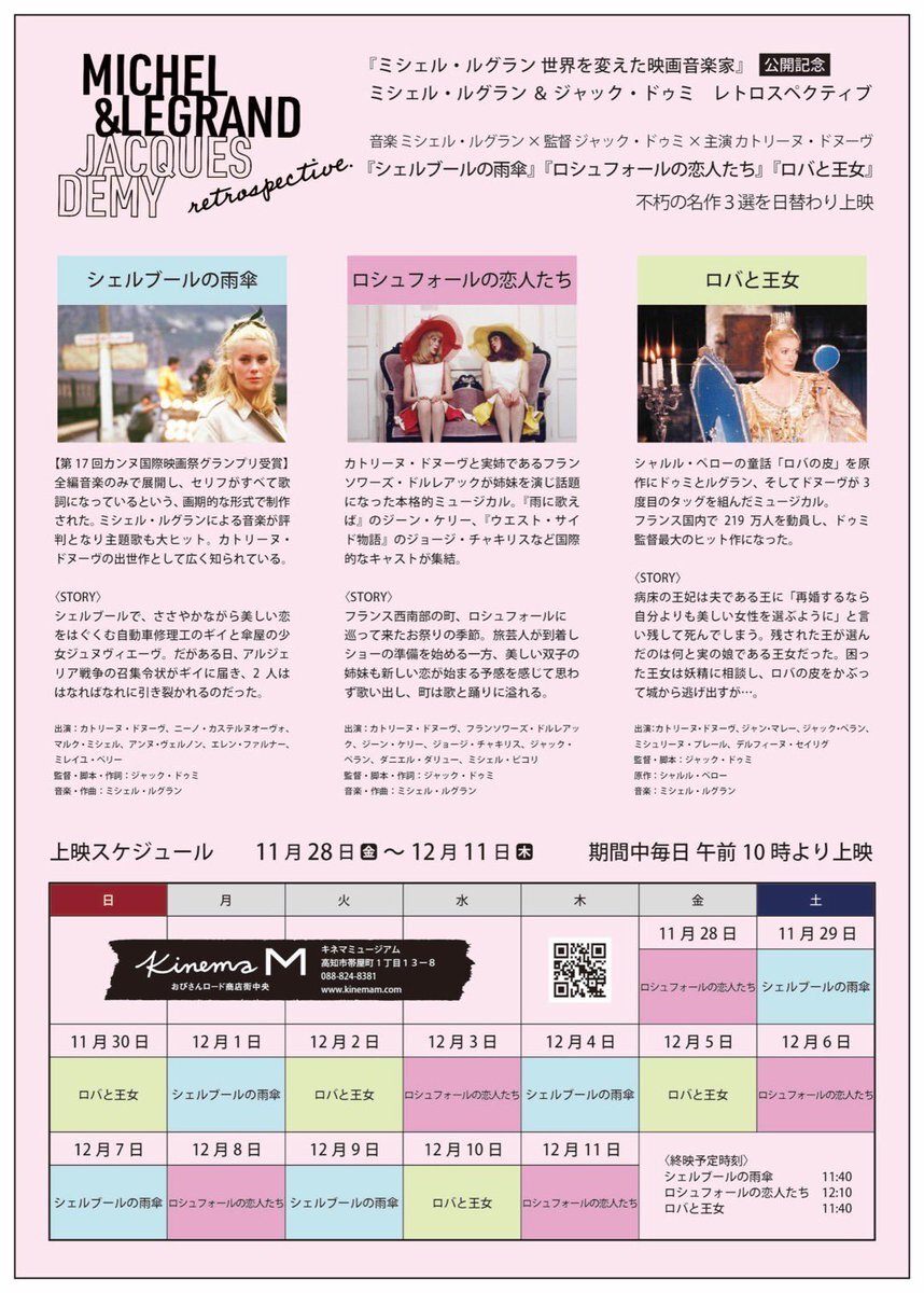 11月28日(金)より上映☂️👒🫏 \「#ミシェル・ルグラン世界を変えた映画音楽家 」公開記念🎉/ 『ミシェル・ルグラン&ジャック・ドゥミ レトロスペクティブ』 🗯️ドゥミ × ルグラン × ドヌーヴ  不朽の名作を2週間限定日替わり上映! ※上映日時は画像をご確認ください。 pic.x.com/lpSCNsJJFH