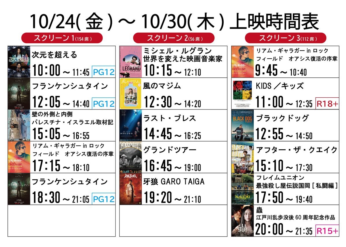 10/24(金)〜10/30(木)の上映スケジュールです ~上映開始作品~ 『#フランケンシュタイン』 『#ミシェル・ルグラン世界を変えた映画音楽家』 『#風のマジム』 『#ラスト・ブレス』 『#ブラックドッグ』 『#アフター・ザ・クエイク』 ご来館お待ちしております🎦 pic.x.com/Zg0CpkBxjV