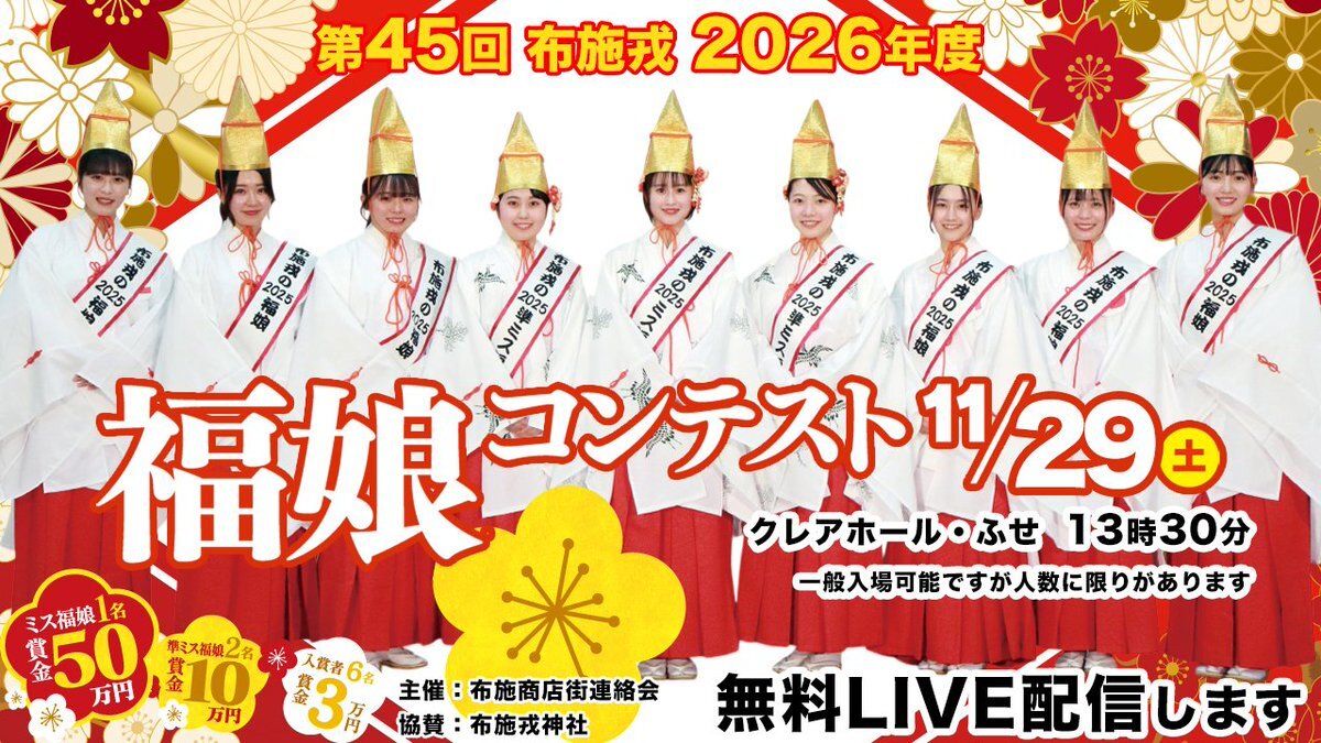 【布施戎福娘コンテスト ライブ配信】 今年も布施戎神社の福娘コンテストが開催されます 11/29(土)13時30分 クレアホール・ふせ 当日はコンテストの模様をライブ配信いたします 布施商店街公式サイトでご覧いただけます fuse.osaka.jp/fuseebisu/ #布施戎 #福娘コンテスト #ミス福娘 #布施商店街 pic.x.com/Qjn7PWY9WW