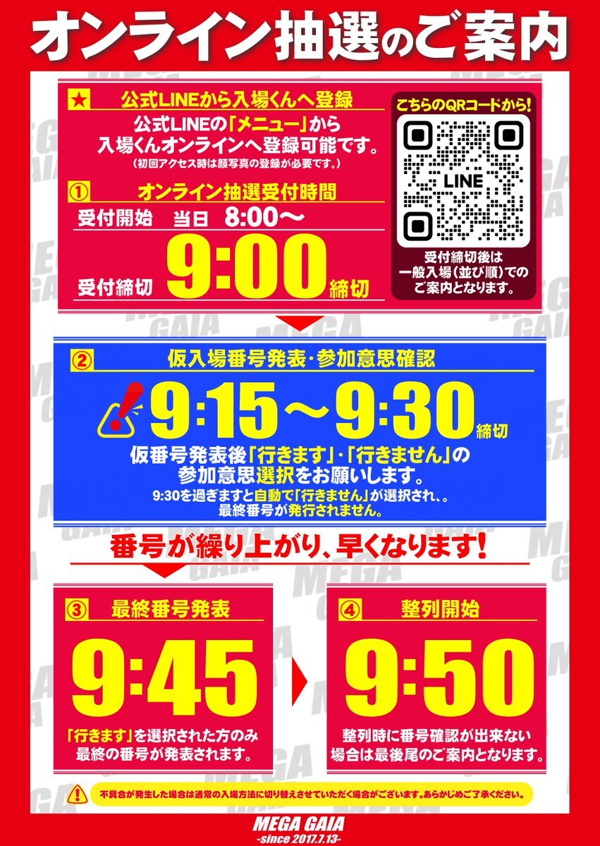 さぁ~まもなくです⚠️ ╭⋟───────── 本日最終ビィィ~‼ 🎀🎀ファン感謝デー🎀🎀 この後本日最初の抽選時間デスヨ~❤️🧡 ──────────⋞╯ A/B/C/Eコース 合計7セットご準備してます🎁 まだ間に合いますよ‼️ 絶対来て下さい🏃💨 #メガガイア #ファン感謝デー pic.x.com/ZYNF2UiPcA