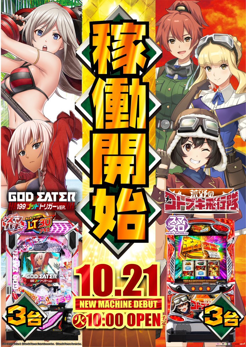 こんばんは #メガガイア岩槻店 です 明日の10月21日(火)も 通常どおり朝10:00開店‼️ 🚨今月は残り、休まず営業致します‼️🚨 そして パチンコ新台 #Pゴッドイーター199ゴッドトリガーVer. スロット新台 #L荒野のコトブキ飛行隊 稼働開始🔥 皆様のご来店お待ちしております🙇‍♂️ pic.x.com/7kasVXtFsj