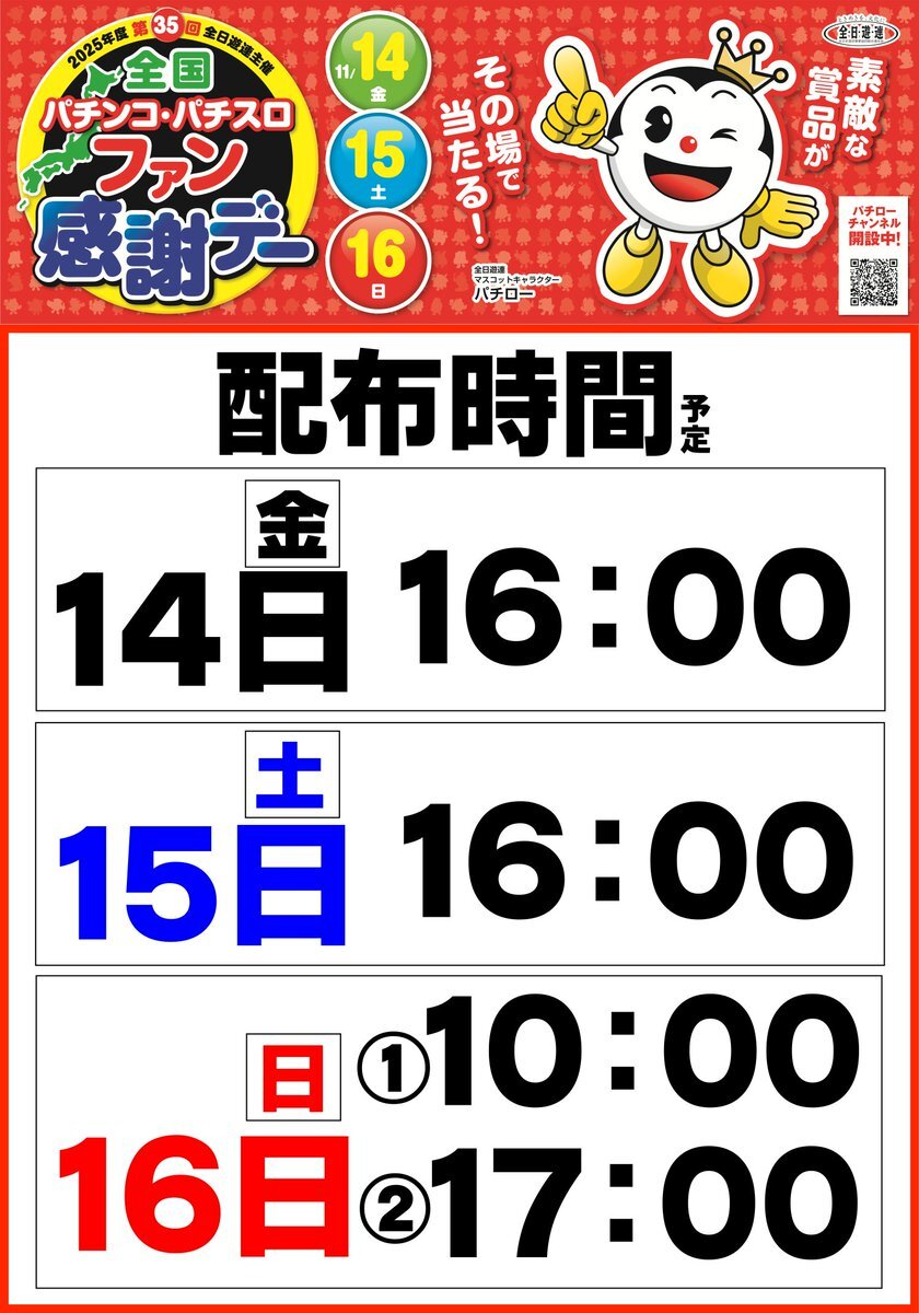 #メガガイア岩槻店 です 明日1⃣1⃣月1⃣6⃣日(日) 朝🔟時開店⏰ 🌎全国パチンコ・パチスロ🌎   🌎ファン感謝デー🌎      🤩開・催🤩 皆様のご来店、ご参加お待ちしております😎 入場くんオンラインはこちら📱 ➡️x.gd/WjJcM #ファン感謝デー pic.x.com/SYRoSTSkOd