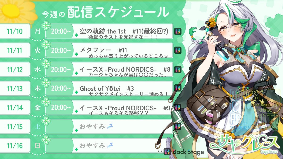 🗓️今週のスケジュール🗓️(11/10~11/16) #サヤの時間割 配信地▶ youtube.com/@sayagrace38/?… 空の軌跡1stおそらく最終回!!!!! 駆け抜けるーーーボス戦はナイトメアのままいく!! 「見届け」てくれ… #GhostofYotei #sora1st #メタファー #イースx pic.x.com/GOtMRos42a