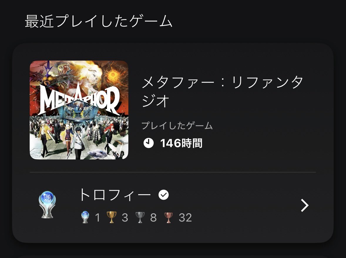 メタファー:リファンタジオ トロコンしました。 コンプ難易度は低めですが2周目限定トロフィーがあるので60時間以上は必要になってきますね。 ストーリーは大ボリューム、キャラクターも魅力的で楽しめました! アトラス作品初めてクリア。 詳細はALTにて。 #メタファー pic.x.com/d21wHxoQV8