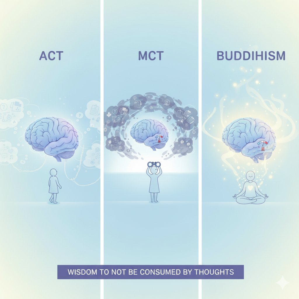 それぞれ異論はあるかもしれないけど ACTは「思考から離れる」 MCTは「思考を観察する」 仏教は「思考も自己も手放す」 そんなイメージ。 似てるようで違うけど、どれも「思考に飲み込まれない」ための知恵。 #メタ認知療法 #ACT #マインドフルネス #心理学の面白さ pic.x.com/EmoXy44kV5