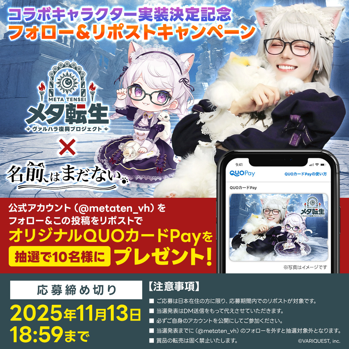 TikTokなどで人気の 名前はまだない。さん(@nekoneko_003) とのコラボキャンペーン開催🎉 限定デザインのQUOカードPay(5,000円分)が 抽選で10名様に当たる🎁 📌応募方法📌 ①本アカウント(@metaten_vh)をフォロー ②この投稿をリポスト 📆応募〆切 2025年11月13日(木) 18:59まで