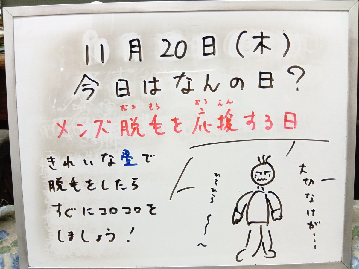 今日はメンズ脱毛を応援する日🧔 日付は脱毛をすることで毛が無くなり、毛穴が引き締まってつるつるすべすべになることに由来して、11月20日を「いい(11)つるすべ(20)」と読む語呂合わせから。 #メンズ脱毛を応援する日 pic.x.com/PofHtrASiX