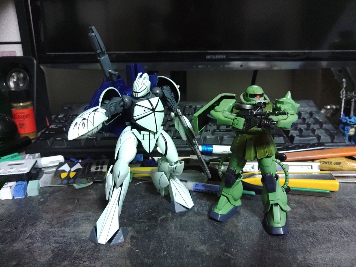 #モデラーとして出戻った理由は何ですか 結婚後にたまたま立ち寄ったリサイクルショップで初期HGUCグフとギャンを買ったのがきっかけですね🤔 スミ入れ、トップコートだけでスゲ〜と思いましたもん🤩 それから直ぐにエアブラシを購入して現在に至ります😆 家族には騙されたと言われますが...😅 pic.x.com/W7cgYxNCIs