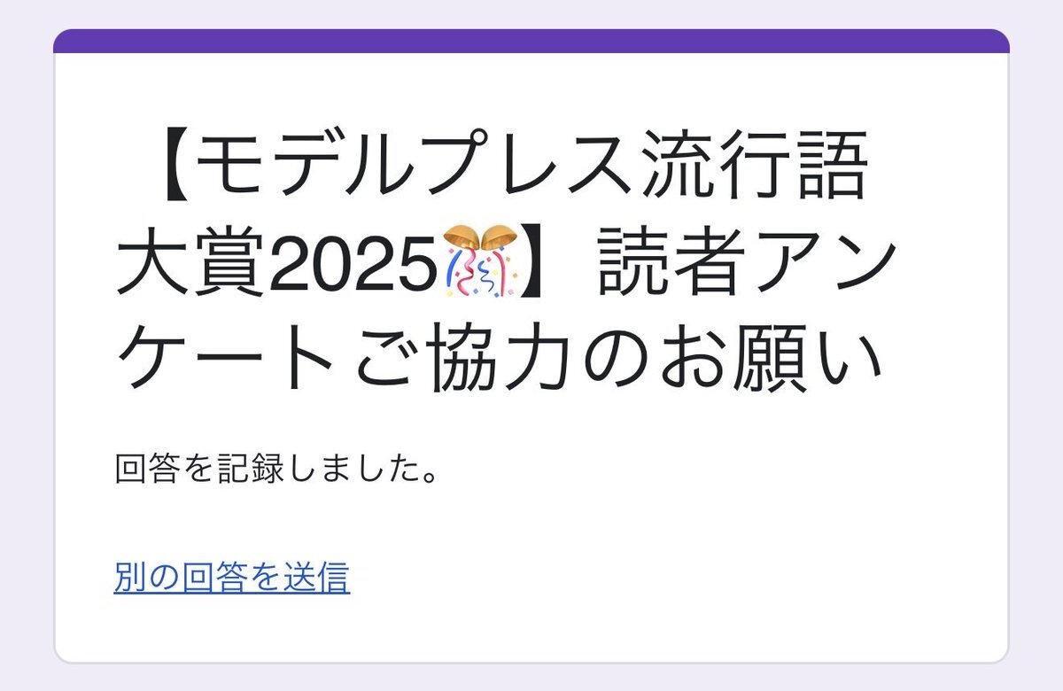 イタくなんかないよ。大賞とって一緒に喜びあいたい🏅 docs.google.com/forms/d/e/1FAI… 毎日投稿1年頑張ったシロセさんに大賞を贈りたい🎁🤍 #モデルプレス流行語大賞2025 #SHIROSE x.com/wjf_shirose/st…