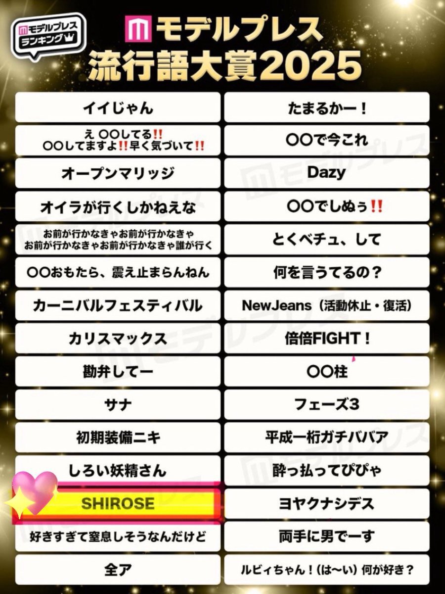 夢みすぎでもイタイやつでもありません。 一定期間をかけて、幅広い層にアンケートをとって調査された結果のノミネートです!たくさんの方が〝SHIROSE〟と言ってくれたのが嬉しいですね💓 大賞とれると信じてます🏆 🗳️投票はこちら🗳️ docs.google.com/forms/d/e/1FAI… #モデルプレス流行語大賞2025 pic.x.com/ECgjaYB6QV x.com/wjf_shirose/st…