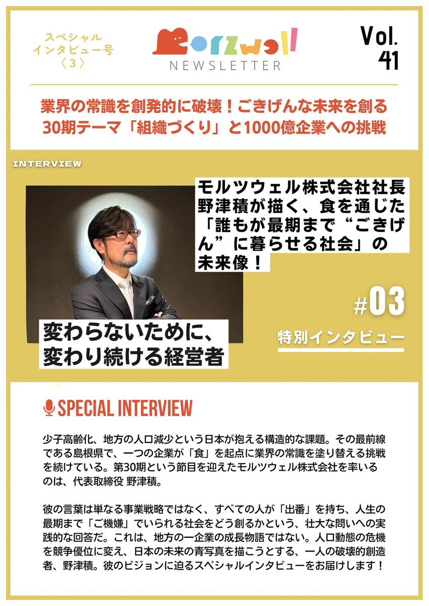 ニュースレターvol.41 スペシャルインタビュー号! 読んでおくレオン。 営業のY morzwell.co.jp #モルツウェル  #野津積 #変わらないために変わり続ける経営者 #読んでおくレオン pic.x.com/gwo3gOZLYm