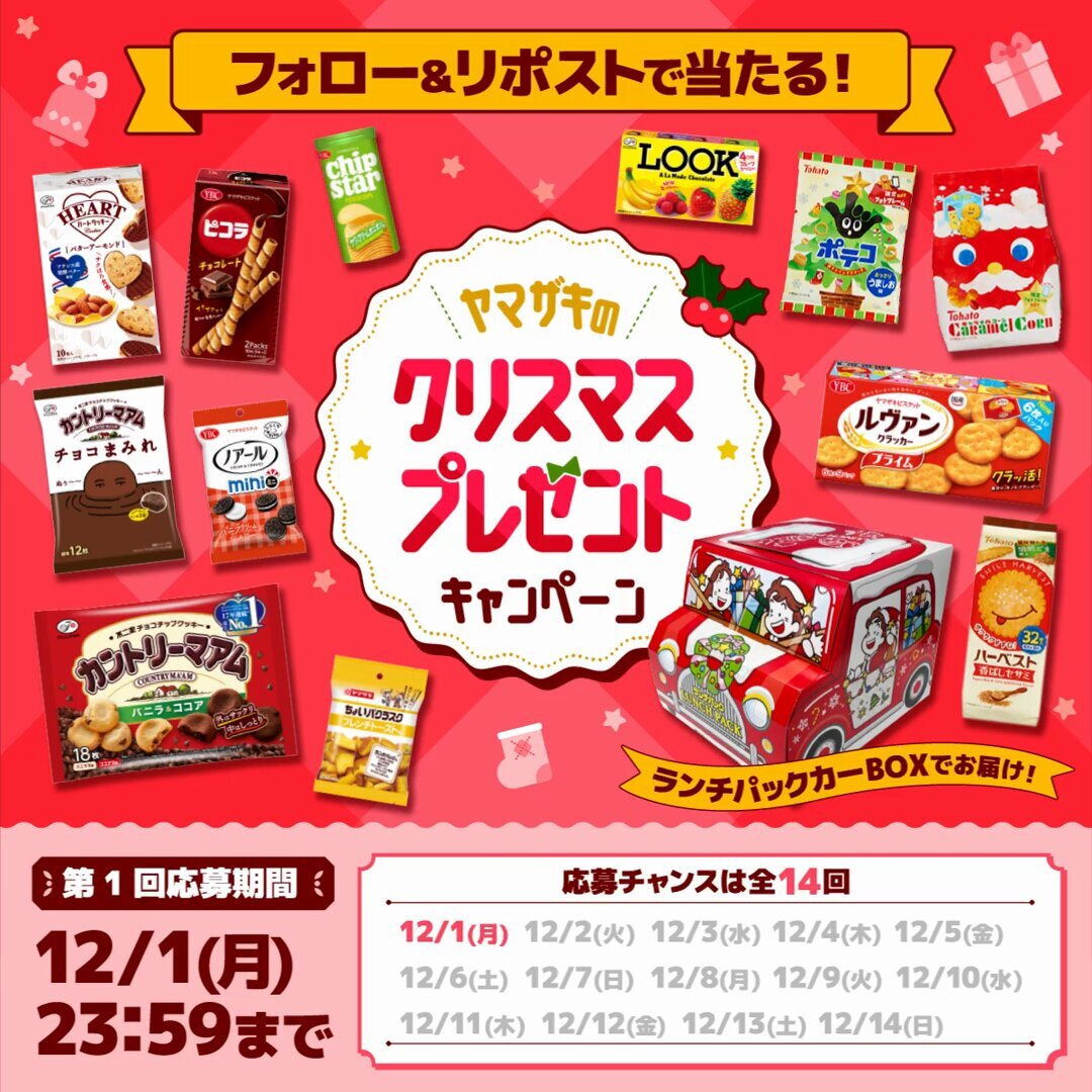 / #ヤマザキのクリスマスプレゼント🎁 キャンペーン \ 本日23:59までにリポストすると、10名様に #クリスマス のお菓子セットが当たる‼️ 12/14(日)まで毎日応募できます🍭 応募方法🌟 ①@yamazakipan_cp をフォロー ②12/1(月)23:59までにこの投稿をリポスト ③結果確認⬇️ gcp.giftee.biz/@8P5tA4kX_Chri… pic.x.com/3mtLNqpJws