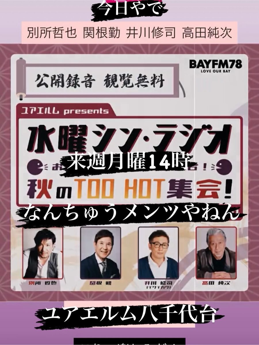 おしゃべりおじさん大集合!秋のTOO HOT集会! 〜井川ご満悦〜 本日ご参加くださった皆様 ありがとうございました! あー笑ったなー 素敵憧れおじさん3人が とにかく三者三様のカッコ良さ✨ ほな明後日ねー! #関根勤 #井川修司 #別所哲也 #高田純次 #シンラジオ #BAYFM #ユアエルム八千代台 pic.x.com/eVKm0z79ZS