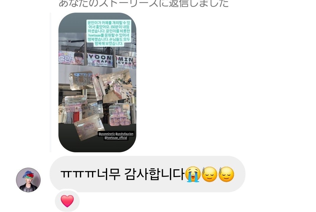 カフェの報告投稿へ社長のdnopfさんからもありがとうございます。とお返事が来ました😭 #howtouse日本に来てくれてありがとう #ユンミン日本に来てくれてありがとう