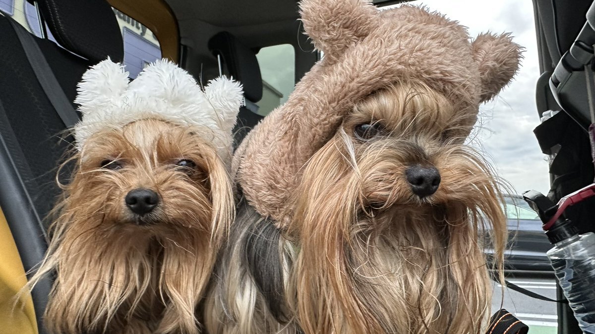 新横浜公園おさんぽ→ばあばのお買い物待ち🛍️ 車内はくまちゃん防寒モードでぬくぬく🐻🐻 A/B/Cどの“くま顔”が好き? 飼い主には全部違って見えるの…💞 #新横浜公園 #ヨークシャーテリア #犬のいる暮らし #くま耳 #テリリアン #Onepack pic.x.com/cHE0W3FPtp