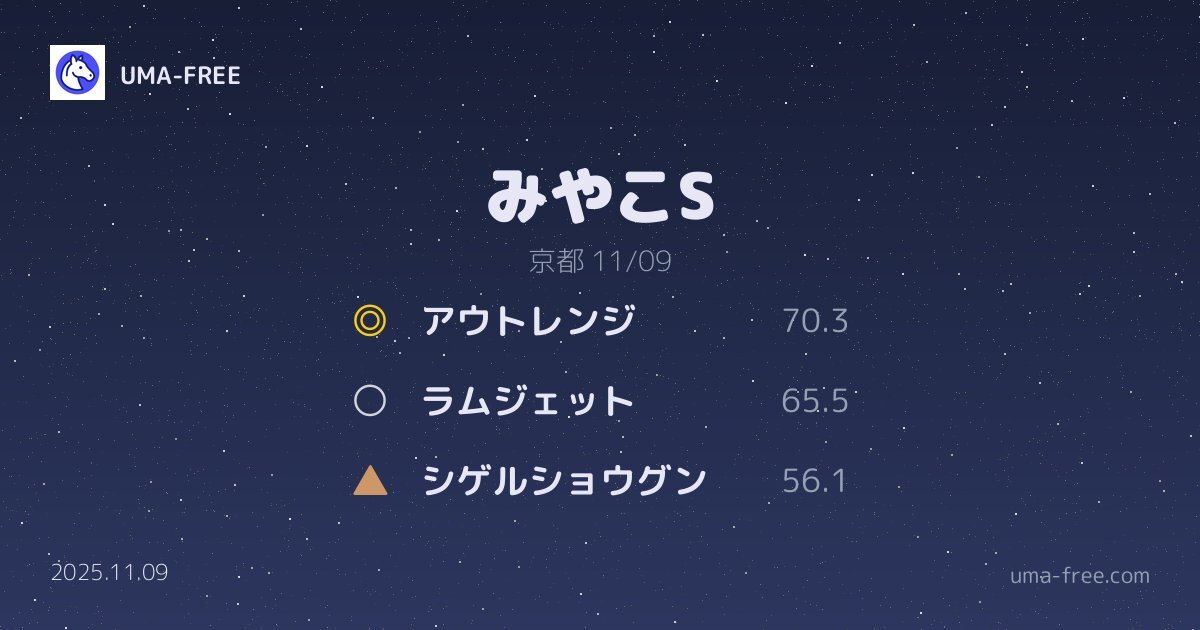 🎯明日のレース AI予想 【みやこS】 京都 11/09 ◎ アウトレンジ (AI偏差値: 70.3) ○ ラムジェット (AI偏差値: 65.5) ▲ シゲルショウグン (AI偏差値: 56.1) ▼詳細はこちら uma-free.com #競馬予想 #AI予想 #みやこS #アウトレンジ #ラムジェット #シゲルショウグン pic.x.com/UOBe8gonTv