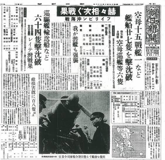 #レイテ沖海戦 しかし当時の日本側は状況把握ができず、大本営海軍部は誇大戦果を発表 この誇大戦果は、先の台湾沖航空戦の誇大戦果と合わせてますます日本側の状況判断を誤らせることになる… 謹んで、この戦いに参加した日米両軍の戦没者のご冥福をお祈りします… (6/6) pic.x.com/YKeAFdJwhc