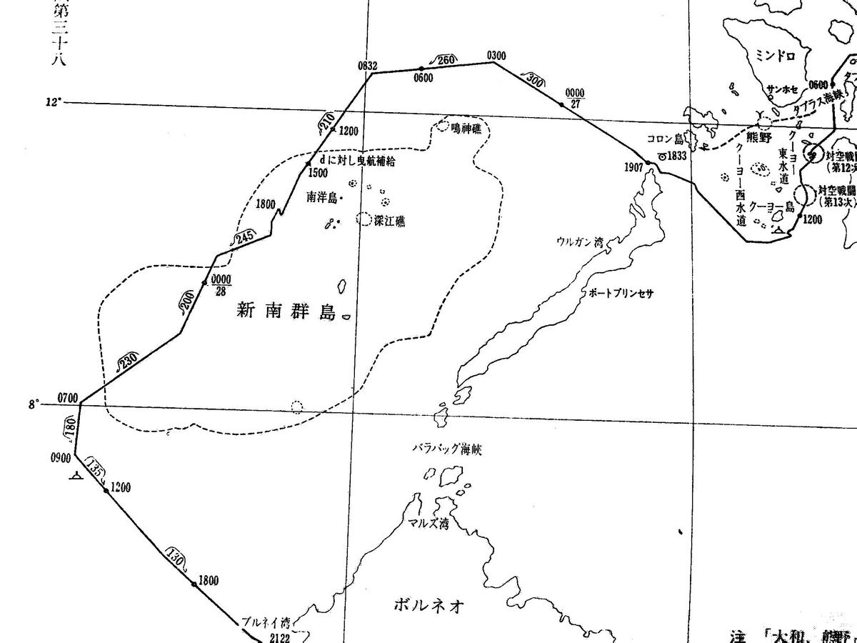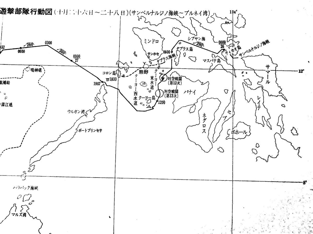 1944年10月27日 栗田艦隊 03:00、艦隊は新南群島の北東海面において、針路260度に変針。この航路は一般には使用されておらず、米潜水艦待ち伏せの意表を衝くものであった。 #レイテ沖海戦 pic.x.com/dBtQLo4iFa