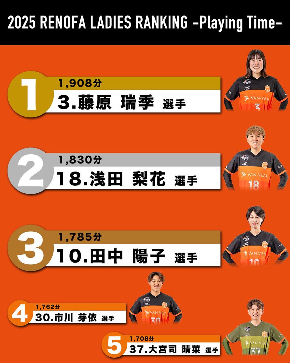 🟠⚪️ 2025Season TEAM RANKING🏆 ー 〜出場時間編〜 🥇 #藤原瑞季 選手 🥈 #浅田梨花 選手 🥉 #田中陽子 選手 4️⃣ #市川芽依 選手 5️⃣ #大宮司晴菜 選手 #一意専心 #レノファレディース pic.x.com/sHcCa8BlKh