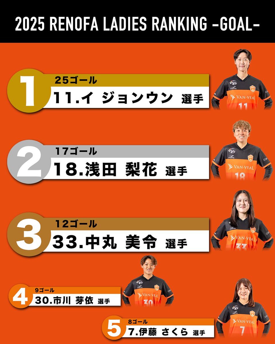 🟠⚪️ 2025Season TEAM RANKING🏆 ー 〜得点編〜 🥇 #イジョンウン 選手 🥈 #浅田梨花 選手 🥉 #中丸美令 選手 4️⃣ #市川芽依 選手 5️⃣ #伊藤さくら 選手 #一意専心 #レノファレディース pic.x.com/F9Ve2yGeiI
