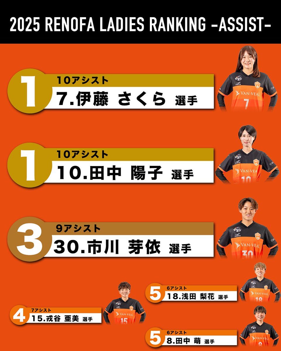 🟠⚪️ 2025Season TEAM RANKING🏆 ー 〜アシスト編〜 🥇 #伊藤さくら 選手 / #田中陽子 選手 🥉 #市川芽依 選手 4️⃣ #戎谷亜美 選手 5️⃣ #田中萌 選手 / #浅田梨花 選手 #一意専心 #レノファレディース pic.x.com/zkRdajtyu6