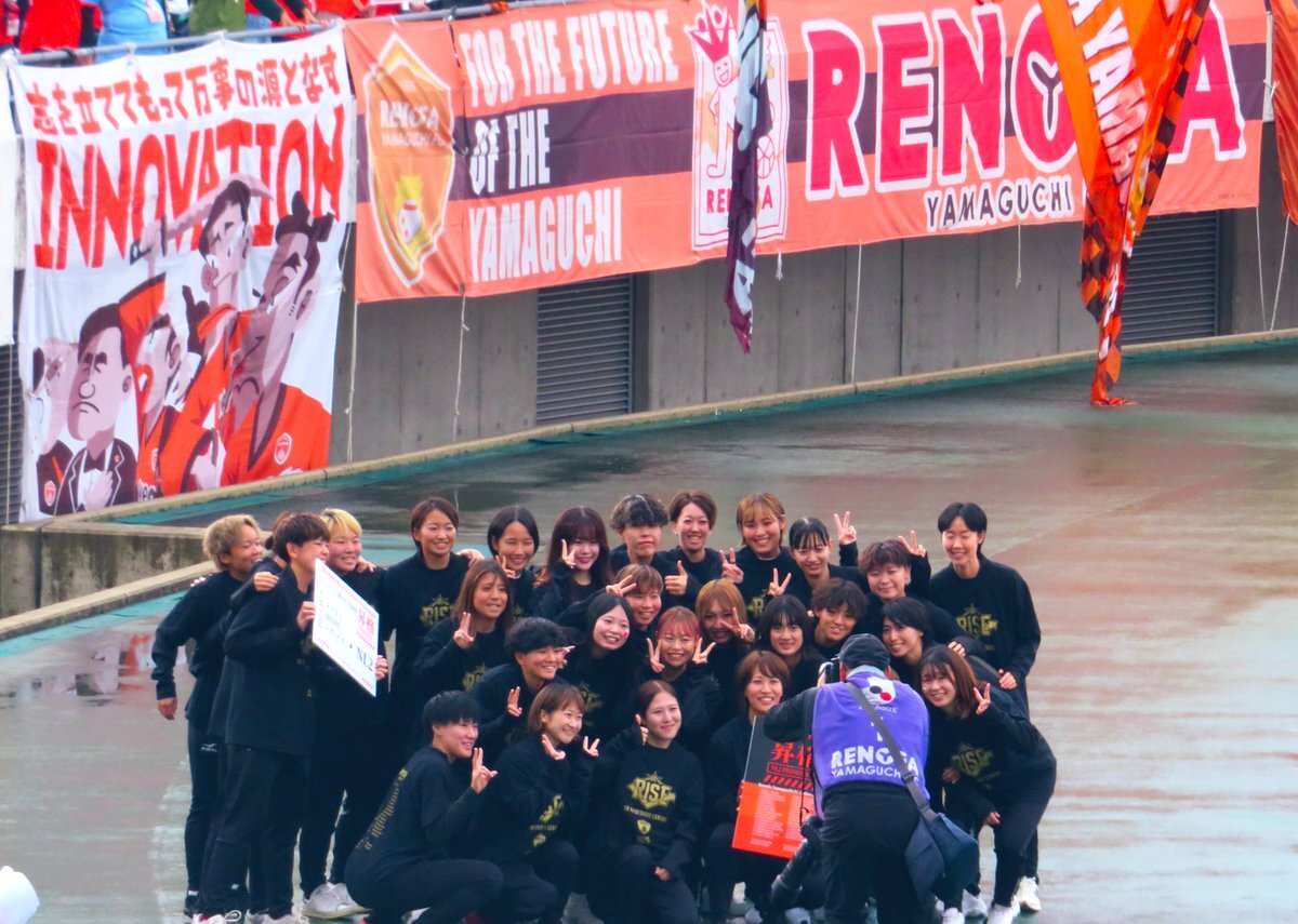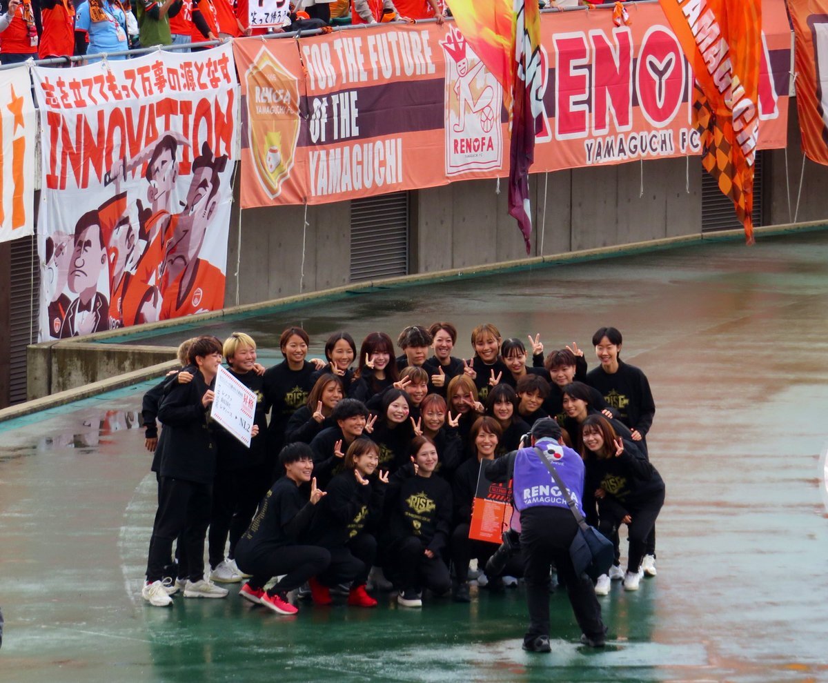 レノファ山口レディース㊗️なでしこリーグ2部参入おめでとう🎉🎉 周回の時間が無くなり💦ゴール裏で記念撮影できず 残念でしたが、、 みんなステキな笑顔でした🧡😄😄😄来季の活躍🔥応援してます‼️ #レノファレディース @renofa_l @akamine_shota #renofa pic.x.com/fj8crj39Kp
