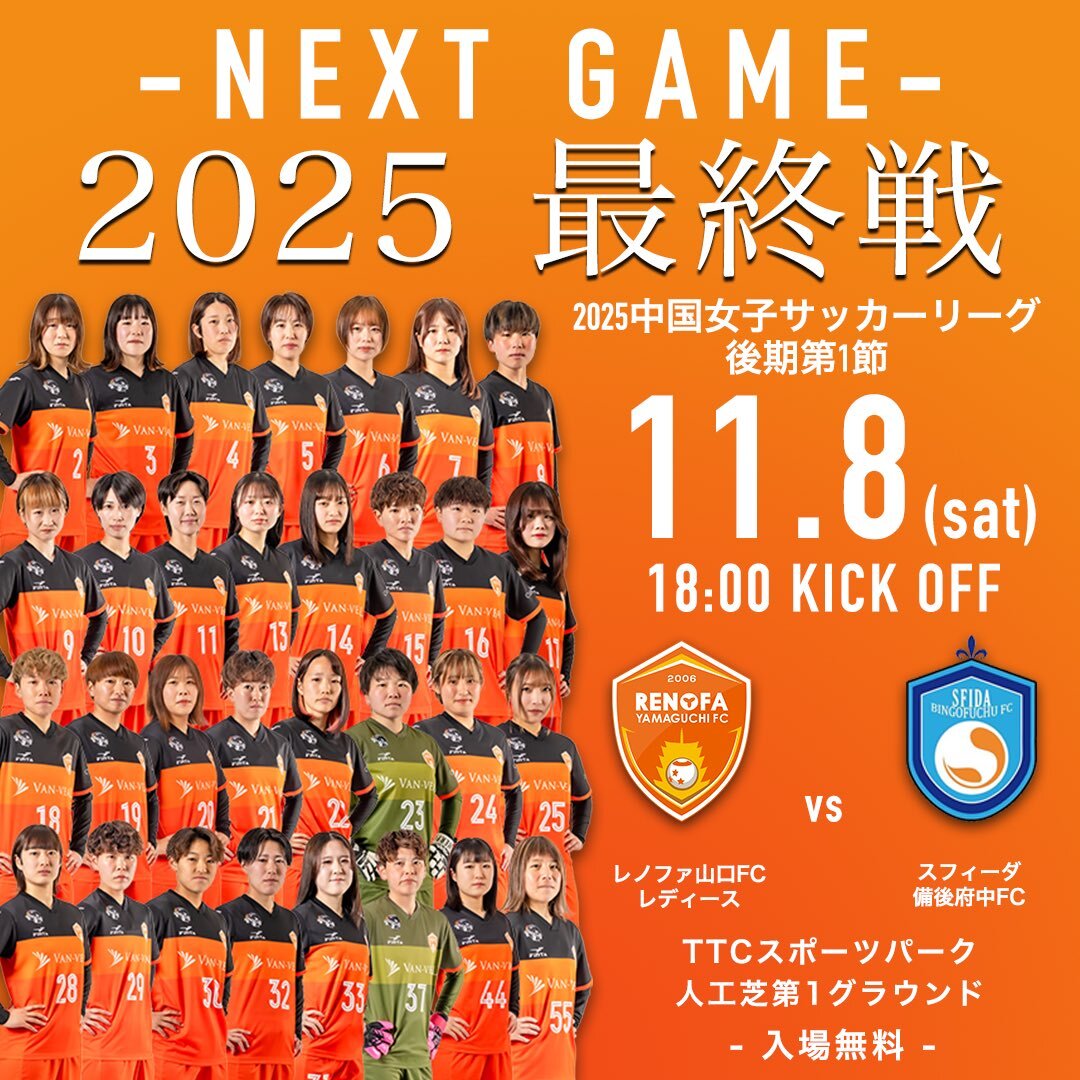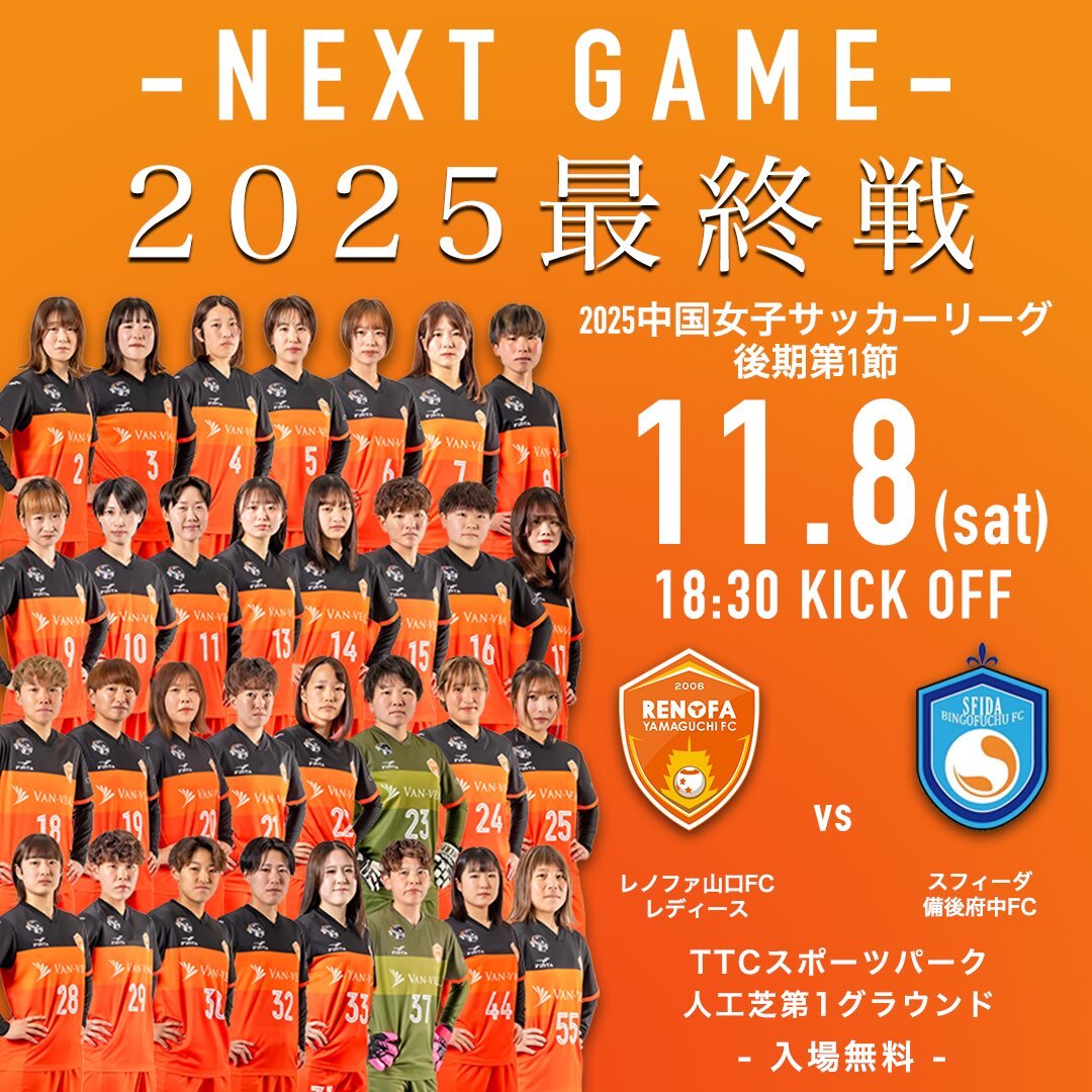 🟠⚪️ NEXT GAME🔥 ー 🏆2025中国女子サッカーリーグ 後期第1節 📅11月8日(土) ⏰18:30 🆚スフィーダ備後府中FC 🏟️TTCスポーツパーク人工芝第1グラウンド 観戦情報はコチラ⏬ renofa.com/archives/16753… #一意専心 #レノファレディース x.com/renofayamaguch…