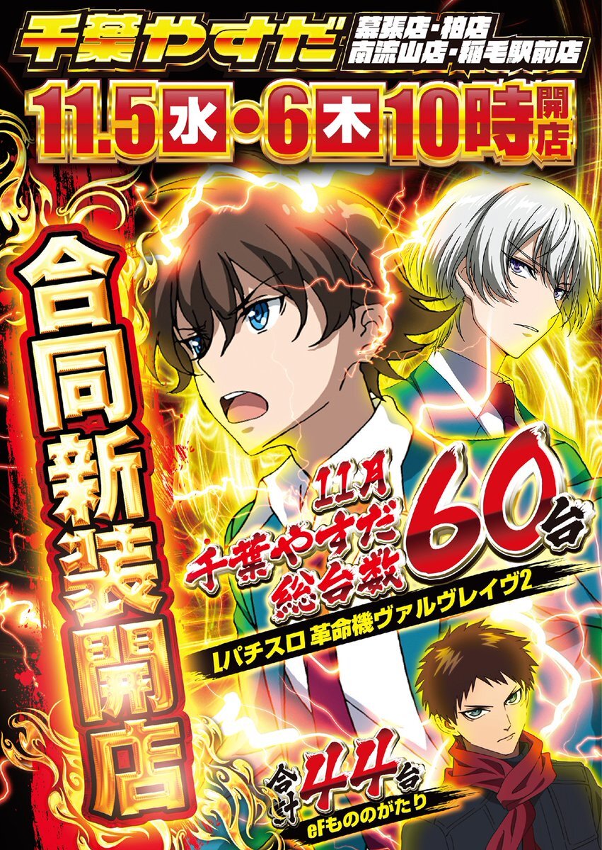 こんばんは🌙 やすだ稲毛駅前店 🎉千葉やすだ合同新装開店🎉 ✨💥✨💥✨💥 #ヴァルヴレイヴ2 #いざ番長 #レヴュースタァライト #源外伝 #いくさの子 #転生したらスライムだった件 #Reゼロ #もののがたり #花の慶次 ✨🚨✨🚨✨🚨 店内告知物は要チェック✅です pic.x.com/fBh7QiPj5T