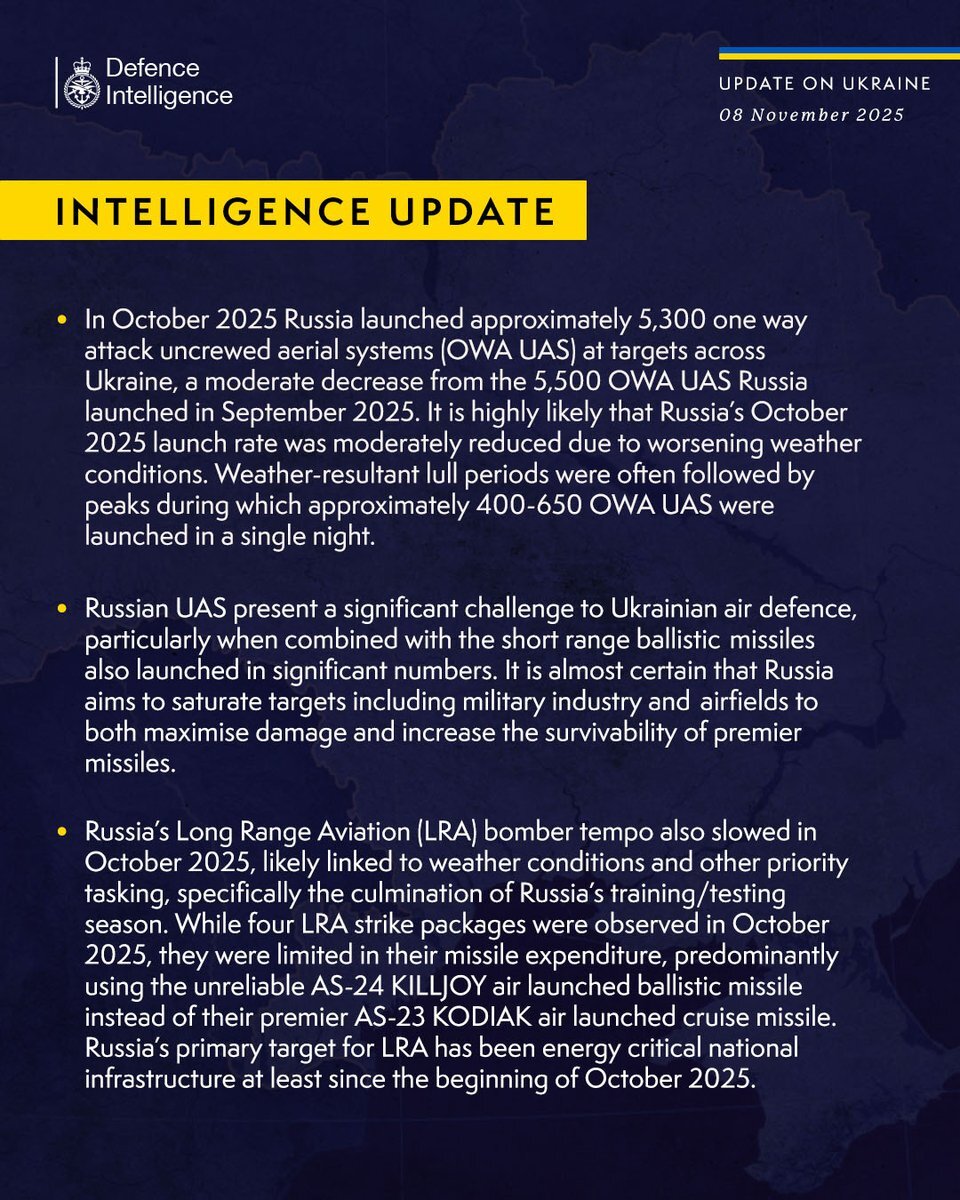 #ロシアのウクライナ侵略 に関する、 #イギリス国防省 情報局の #現時点での評価 (2025年11月8日)。 2025年10月を通じてロシアは約5300機の片道攻撃型無人機(ドローン)を発射しており気象条件により前月から微減となった、悪天候の後は一晩で400から650機のドローンが使われた (続く) x.com/DefenceHQ/stat…