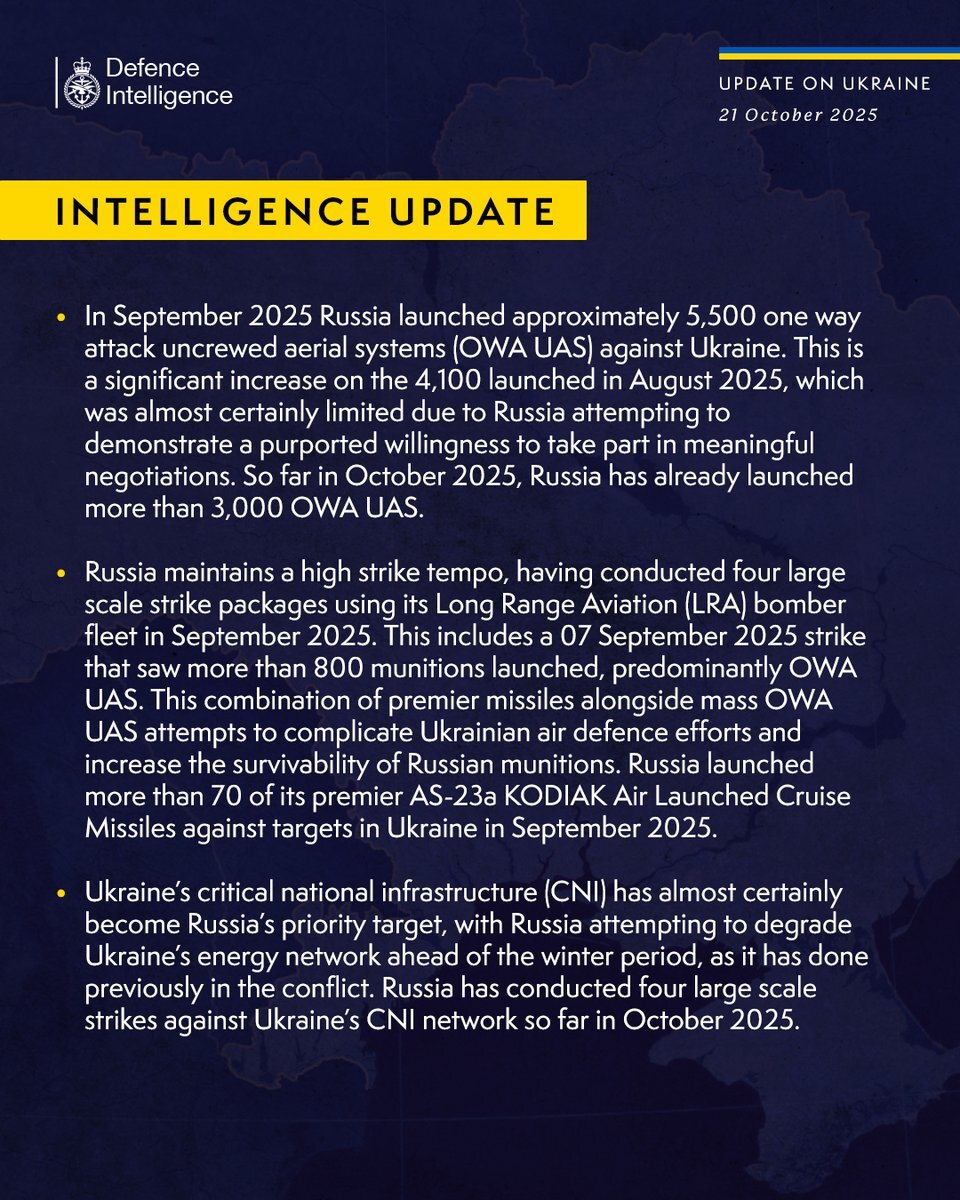 Latest Defence Intelligence update on the situation in Ukraine - 21 October 2025. Find out more about Defence Intelligence's use of language: ow.ly/vJIB50XfFu3 #StandWithUkraine