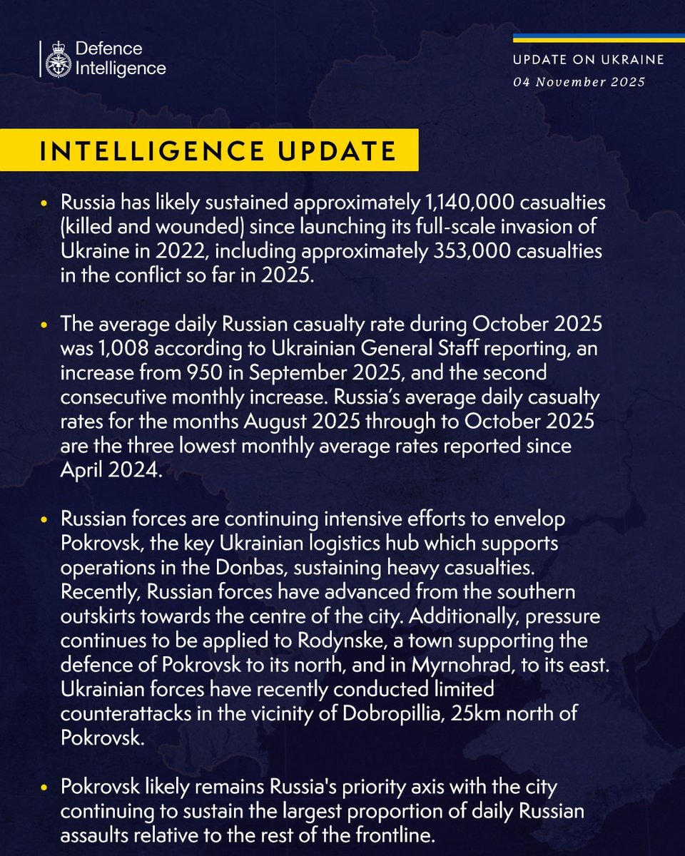 Latest Defence Intelligence update on the situation in Ukraine - 04 November 2025. Find out more about Defence Intelligence's use of language: ow.ly/PRfn50Xlk4x #StandWithUkraine