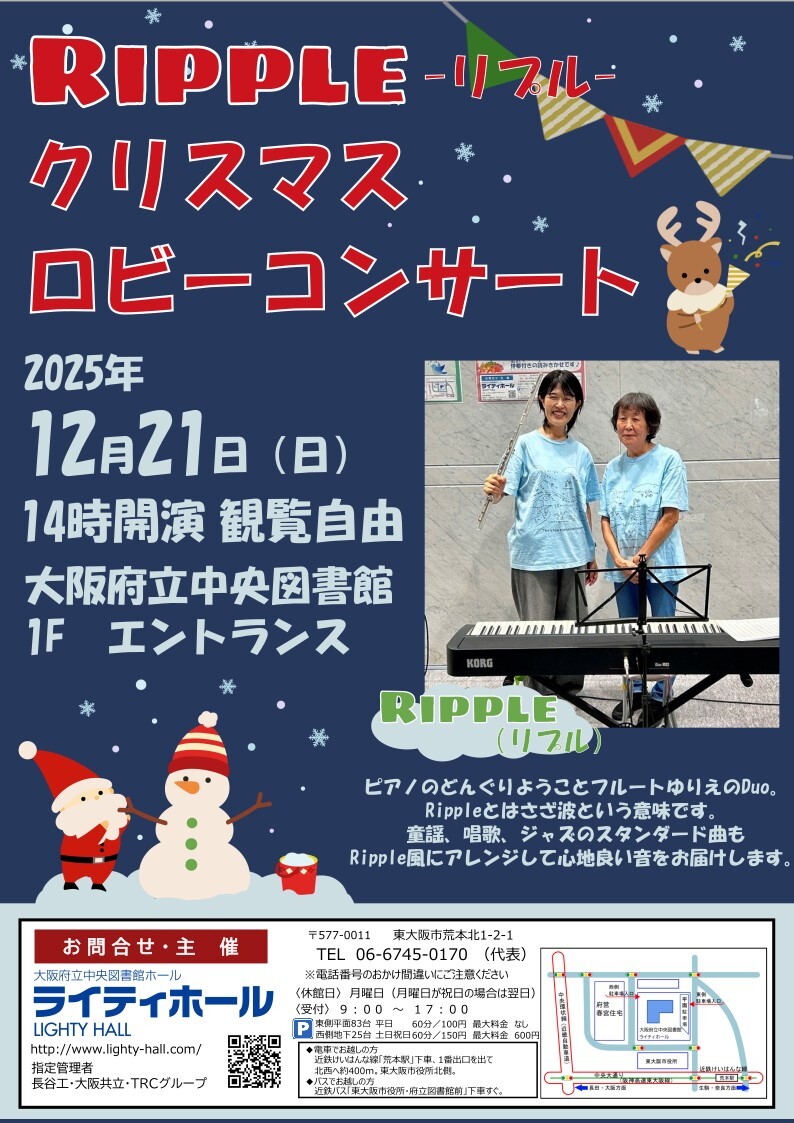 ♪RIPPLE(リプル) クリスマスロビーコンサート♫🎉 🎅12月21日(日)14時 🎅1階エントランスホール 🎅観覧自由 皆さまのお越しをお待ちしております。 bit.ly/4i0fkcu #フルート #ピアノ #ロビーコンサート #大阪府立中央図書館 pic.x.com/oNS4mnaflL