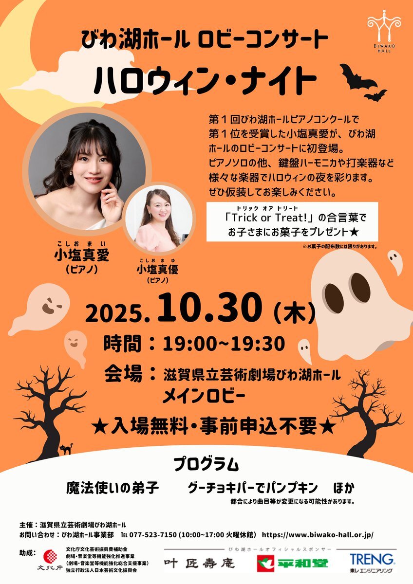【10/30 19時~ #びわ湖ホール ロビーコンサート #ハロウィン #ナイト】 毎年大好評ハロウィンナイト😊今回は第1回びわ湖ホールピアノコンクール第1位の小塩真愛がピアノソロの他、鍵盤ハーモニカや打楽器など様々な楽器でハロウィンの夜を彩ります。ぜひ仮装してきてね👻 #入場無料 #お子様歓迎