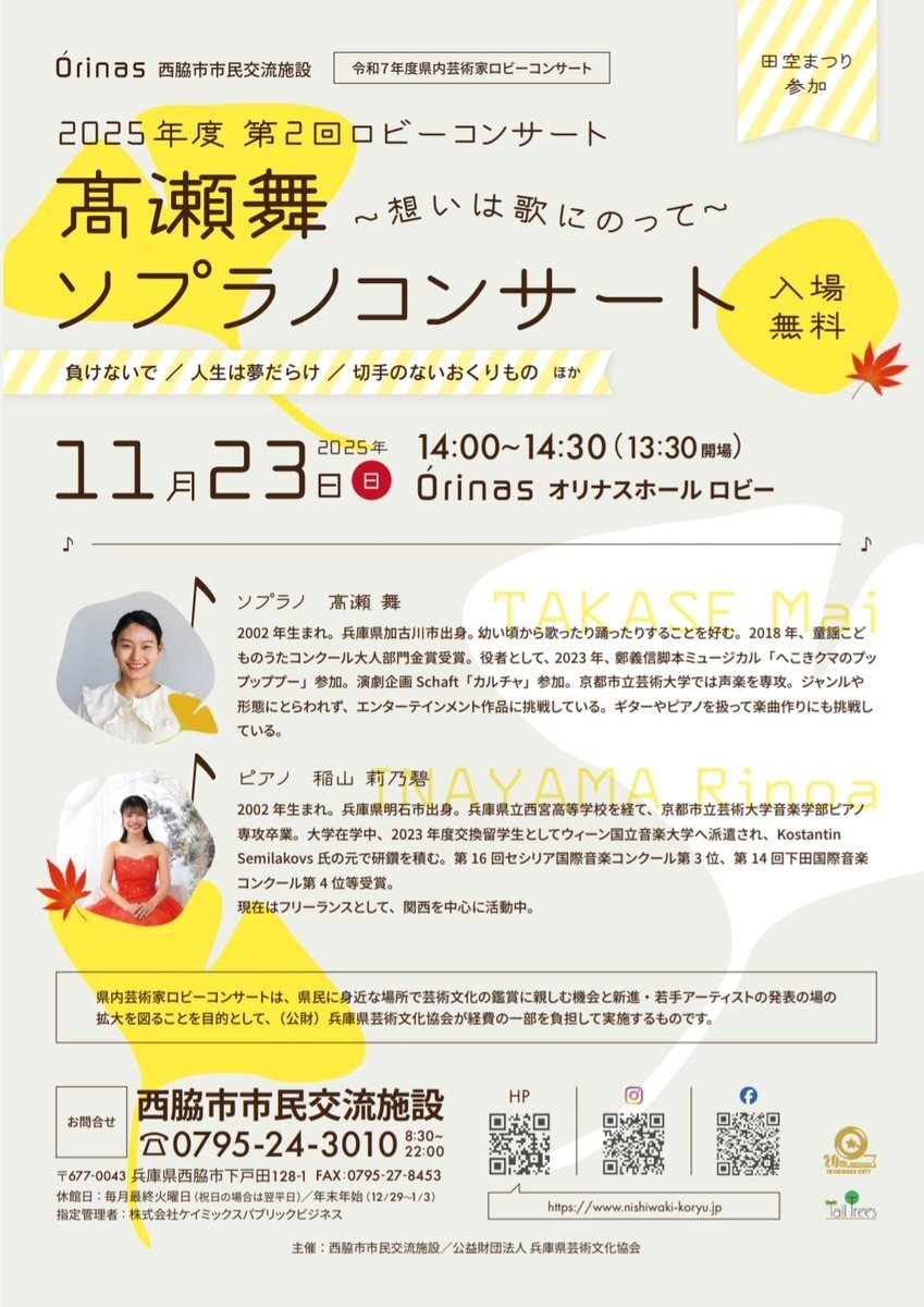 🍁\\ 入場無料 //🍁 11月23日(日)14:00〜西脇市民交流施設オリナスにて、ロビーコンサートをさせていただけることとなりました✨ ピアノは大好きな、稲山莉乃碧ちゃん! 温かな時間を、歌でお届けしたいと思っています…!ぜひ西脇までお越しください🎶 #西脇市民交流施設 #ロビーコンサート pic.x.com/92L8z2nd1R