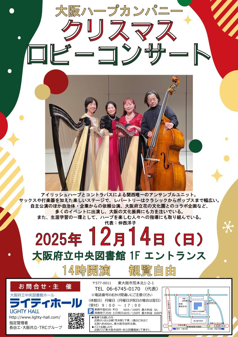 ♪大阪ハープカンパニー クリスマスロビーコンサート♫🎉 🎄12月14日(日)14時 🎄1階エントランスホール 🎄観覧自由 皆さまのお越しをお待ちしております。 bit.ly/4r1pi1v #大阪ハープカンパニー #ロビーコンサート #大阪府立中央図書館 pic.x.com/yGUnBFH4ei