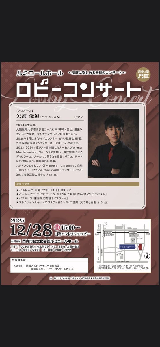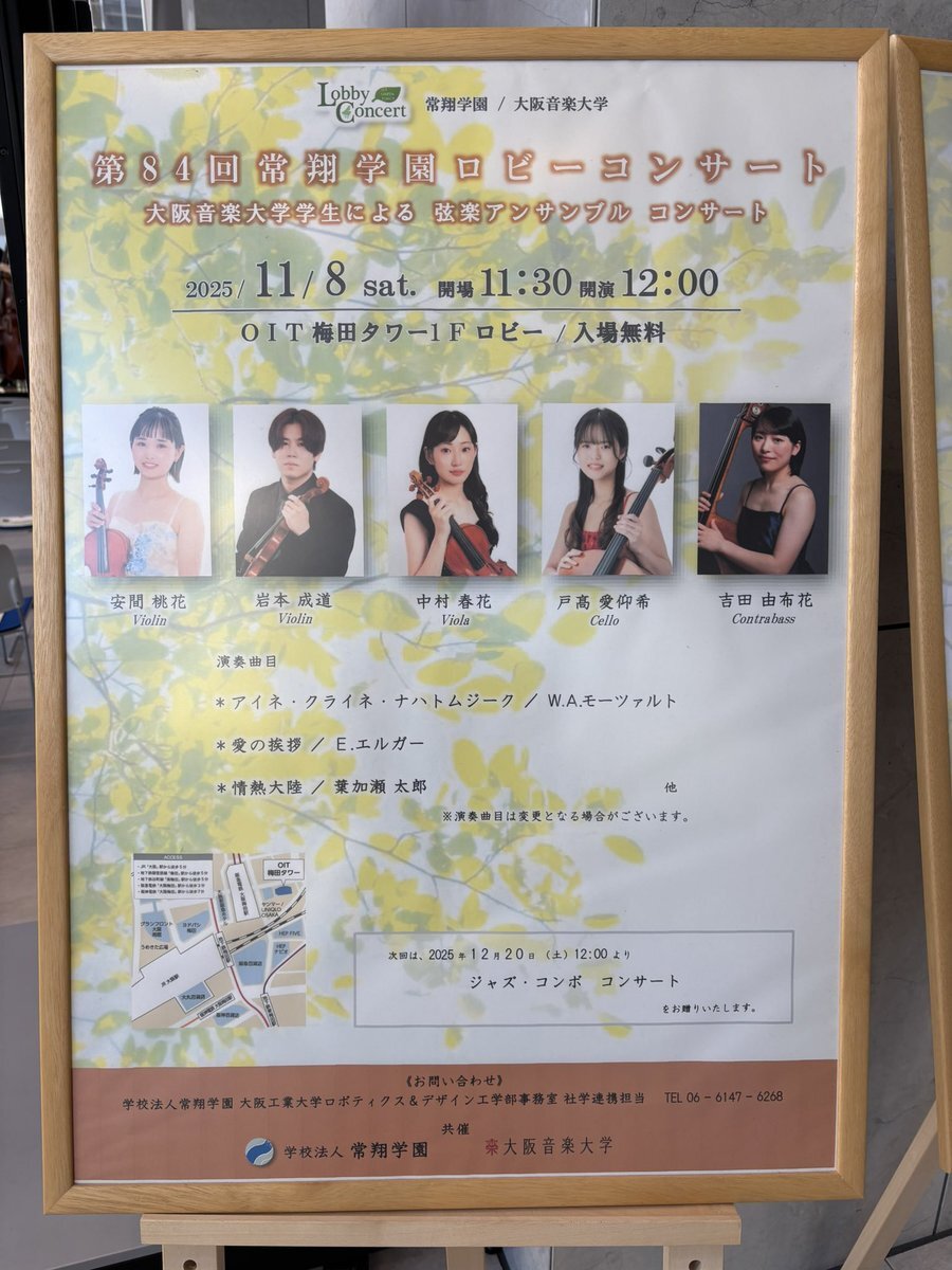 第84回常翔学園ロビーコンサートにご来場いただき、有難うございました! 弦楽アンサンブルの華やかな響きがロビーいっぱいに広がりました🎵 次回は 12月20日(土)12:00〜 常翔ホールにて、ジャズ・コンボコンサートをお届けします。ぜひご来場ください! #ロビーコンサート #常翔学園 #大阪音楽大学 pic.x.com/hamDDUezEj