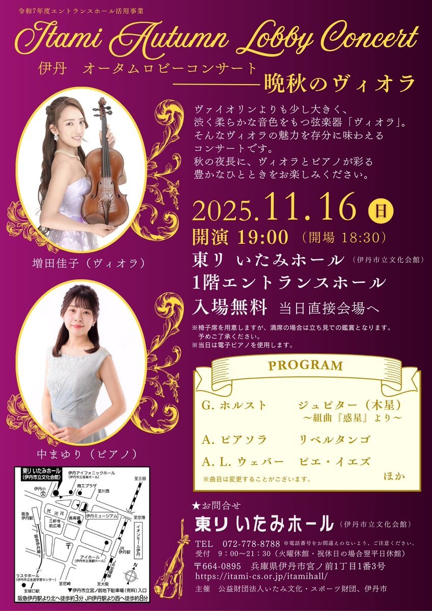 \明日開催/ 「#伊丹 オータム #ロビーコンサート-晩秋のヴィオラ🎻」 渋く柔らかな音色の #ヴィオラ 🎻の魅力を存分に味わえるコンサート✨お楽しみに! 11月16日(日) 19:00開演 18:30開場 #東リいたみホール エントランスホール 入場無料 直接会場へ🎶 詳細👉x.gd/Gvzzo pic.x.com/pFf4YXT6yU