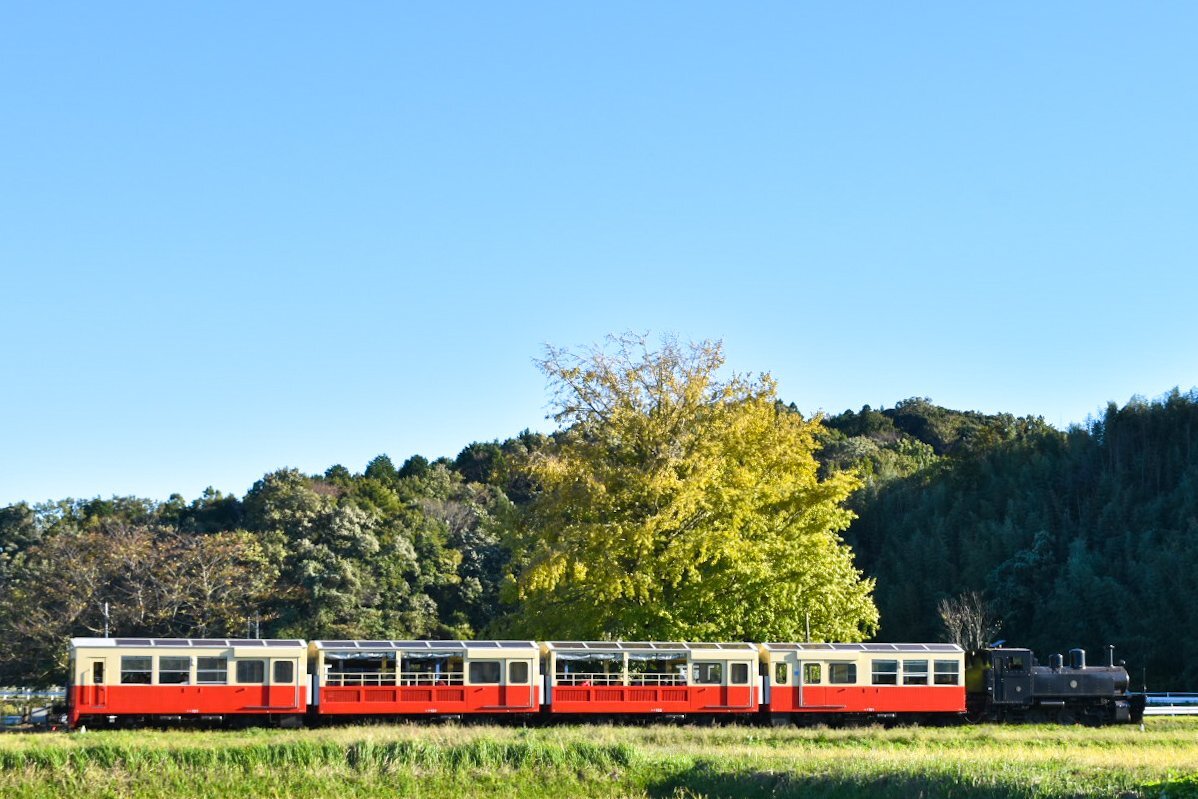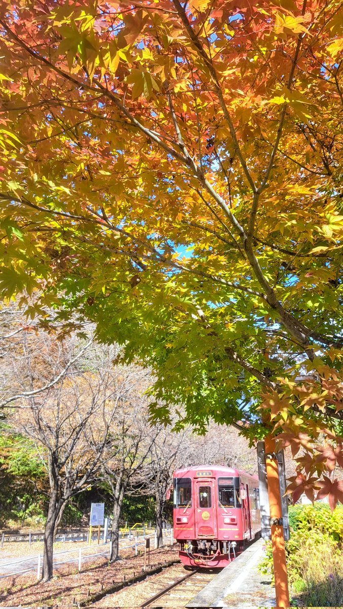 トロッコ列車と大銀杏 晴れて良かった! 青空の下、里山トロッコ列車と大銀杏の素敵な風景を撮ることができました😊 大銀杏が黄金色になった頃、また行きたい。 #大銀杏 #里山 #ローカル鉄道 pic.x.com/NtQpNMQvx2