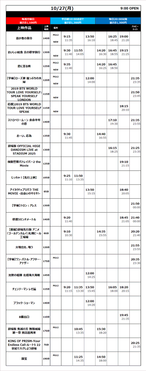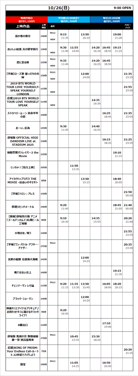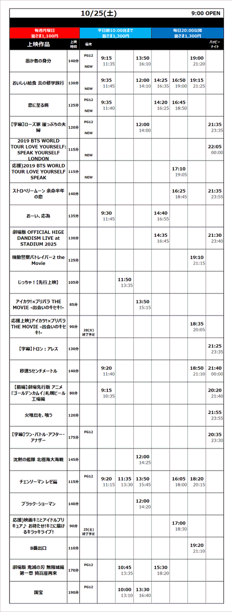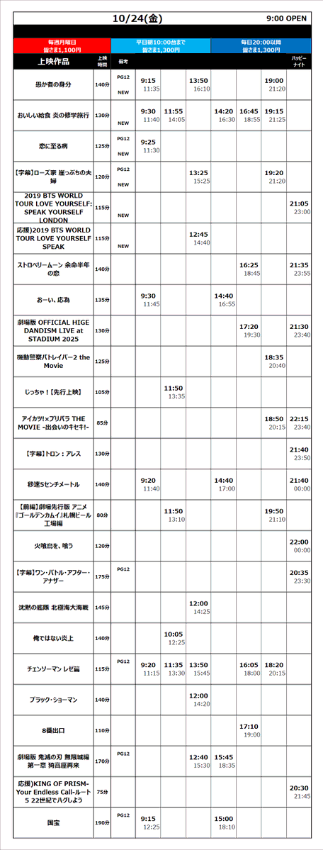 10月24日~10月30日までの上映スケジュールです! 全日9:00OPENになります! 今週の新作は―――こちらッ!! 🆕「#おいしい給食」 🆕「#ローズ家~崖っぷちの夫婦~」 🆕「#映画愚か者の身分」 🆕「#恋に至る病」 是非お越しくださいませ♪ pic.x.com/X1099Fke2s