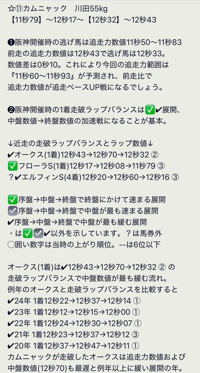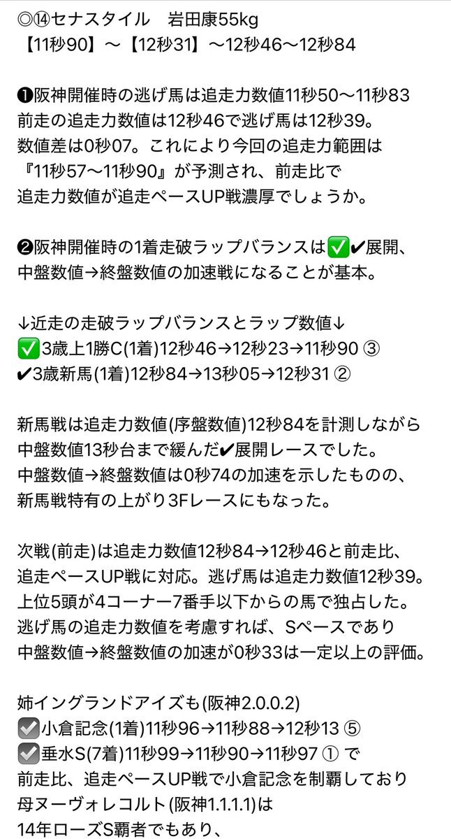 #ローズS note最終結論📝 いいね + RP(RT) お願いします🤲 note.com/uni_keiba2/n/n… ◎本命穴馬の激走に期待します🔥 阪神開催時の逃げ馬は追走力数値(序盤数値) 11秒50〜11秒83となり、土曜の馬場も 速い追走力数値が計測されるような状態です。 阪神開催時の1着走破ラップバランスは基本的に