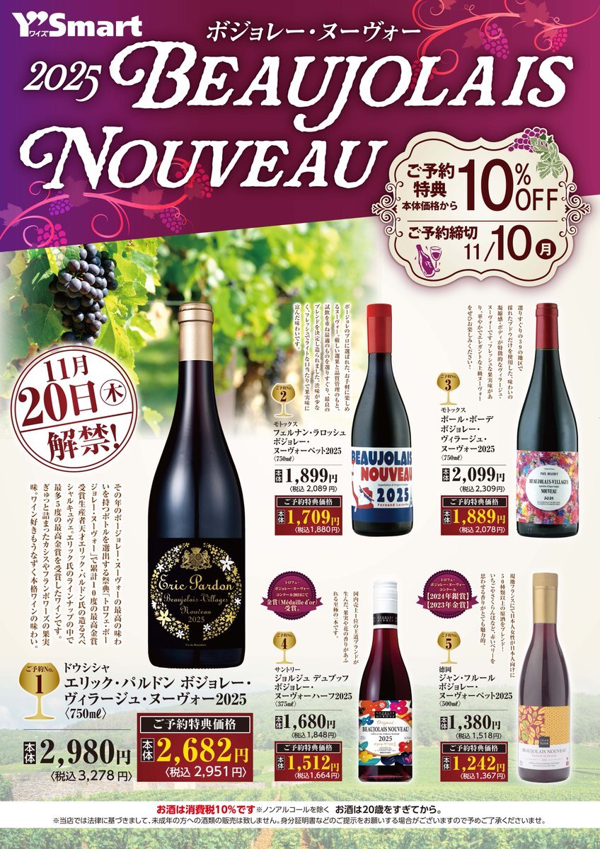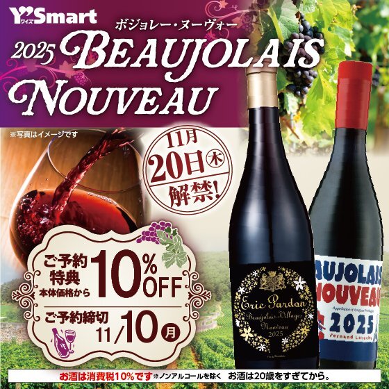 \今年もやってきました🍷/ ワイズマート全店で ボジョレー・ヌーヴォーの予約受付中! 11/10までのご予約で、なんと! ご予約特典【10%OFF】✨ 今年もおいしい1本を見つけませんか。 店頭のリーフレットをチェックしてね!🐰 解禁日:11/20(木) #ワイン #ボジョレーヌーヴォー