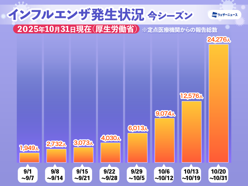 <インフル患者数は2.4万人超え> 10月31日(金)、厚生労働省は2025年10月20日〜26日のインフルエンザ発生状況を発表。この1週間における定点医療機関からの報告数は24,276人。東京都は都内の患者報告数がインフルエンザ注意報基準を超えたと発表しています。体調にご注意を。 weathernews.jp/news/202510/31…